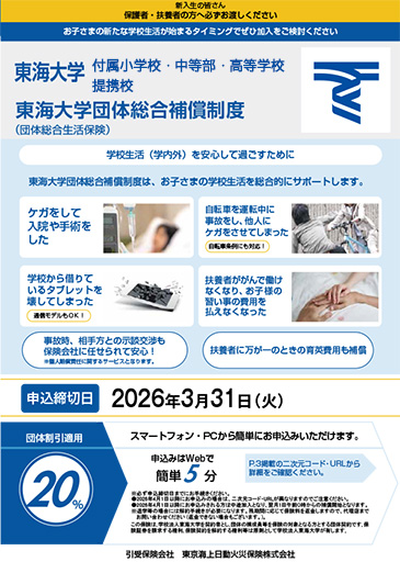 本サイトでは、学生団体保険・教職員の団体保険の概要についてご紹介しています。その他、特定の保険会社や商品名のない記載は一般的な保険商品に関する説明です。取扱商品、各保険の名称や補償内容は引受保険会社によって異なりますので、ご契約(団体契約の場合はご加入)にあたっては、必ず重要事項説明書や各保険のパンフレット(リーフレット)等をよくお読みください。ご不明な点等がある場合には、東海ウィング代理店までお問い合わせください。